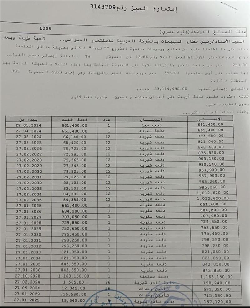 عدد الاقساط المتبقية شهرى : 0